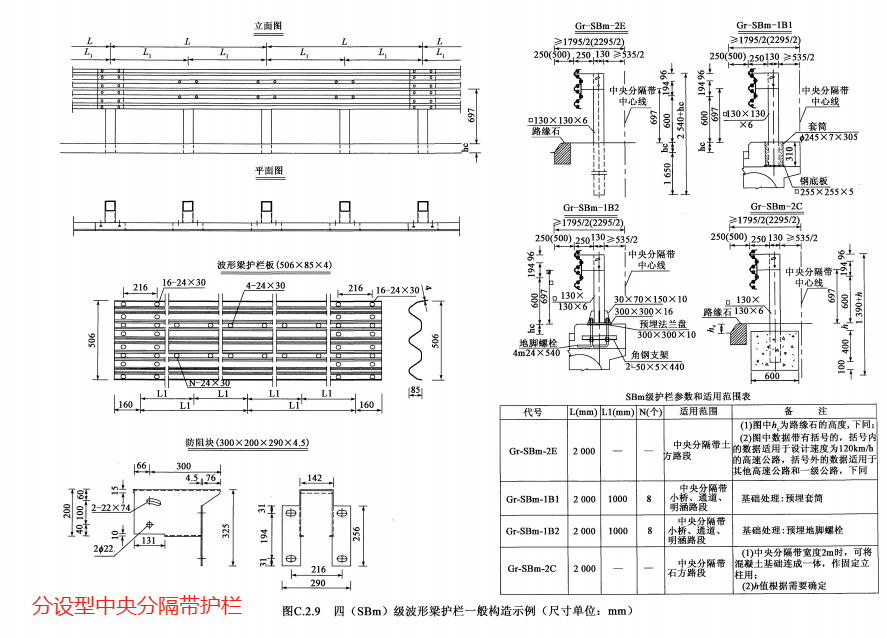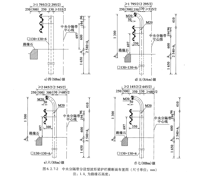 防護等級代碼分別為Am、SBm、SAm、SSm、HBm級的分設型中央分隔帶護欄的構造形式與代碼分別為A、SB、SA、SS、HB級的路側護欄基本相同。