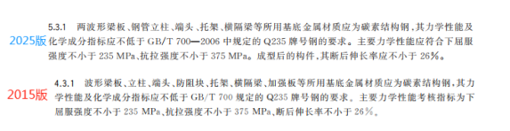 r) 更改了兩波形梁板、鋼管立柱、端頭、托架、橫隔梁等構件的材質要求(見 5.3.1,2015 年版的4.3.1);