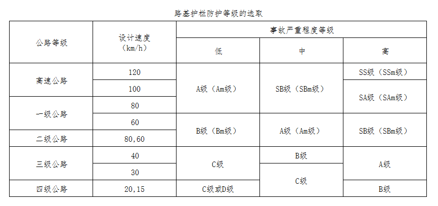 事故嚴重程度等級是判斷護欄防護等級選取的重要前置條件,同時也相關(guān)護欄設(shè)置必要性的判斷條件,當?shù)燃墳?/span>“高”時,必須設(shè)置護欄,當?shù)燃墳椤爸小睍r,應(yīng)設(shè)置護欄,當?shù)燃墳椤暗汀睍r,宜設(shè)置護欄。