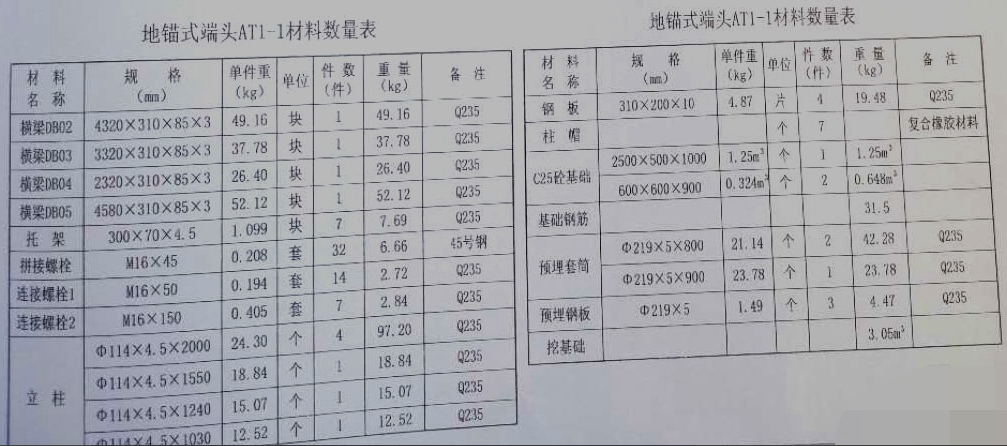 地錨端頭由多種規(guī)格的波形護欄和立柱組成,其中常見的配比組成材料如下圖: