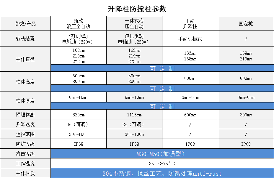 升降路樁采用一體式獨立液壓驅動,柱體大都采用304不銹鋼材質,升降速度最快的在2秒左右,這些快速升降的路樁主要用于一些敏感區域,并且他們都具備一定的防撞性能,抵御車輛惡意沖撞。這些路樁安裝在地面上當他們降下時可以讓車輛隨意通過,降下狀態時可以和地面一樣齊平,當車輛從路樁上面經過時甚至感覺不到它的存在。
